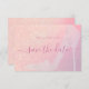 Baseado em um belo gradiente de cor pastel rosa e roxo, com um toque de brilho e cintilação. Este convite de casamento personalizado para salvar a data lê Um conto de fadas começa, seguido pela data, local e nome do casal feliz em texto editável em rosa e roxo. Na frente, o convite lê Salve a data em caligrafia elegante florida ao lado do sapato ajusta e um sapato inspirado no conto de fadas mágico da Cinderela.