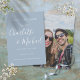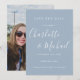 Elegante cartão de salvar a data em azul empoeirado com nomes em estilo de assinatura, este cartão pode ser personalizado com as informações do seu dia especial de casamento em tipografia chic e sua foto especial no verso. Projetado por Thisisnotme©