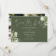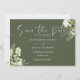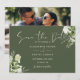 Este cartão de save-the-date floral de verde oliva botânico elegante pode ser personalizado com suas informações em tipografia chic com sua foto especial no verso. Projetado por Thisisnotme©