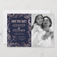 Elegante, moderno e sofisticado cartão de Save-the-Date de casamento com padrão floral desenhado à mão em azul marinho e dourado rosa, tendência do momento. Este design clássico e sofisticado é perfeito para o casal que vai se casar e é moderno e elegante. Personalize com sua própria mensagem na frente, bem como um monograma inicial personalizado no verso. Todo o design de impressão de foto.