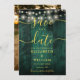Esta elegante corda verde esmeralda ilumina madeira ruidosa madeira boho cartão salvo-a-data pode ser personalizado com suas informações em tipografia de ouro chico e foto especial no verso. Projetado por Thisnotme©