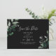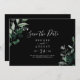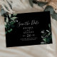 This emerald greenery black horizontal save the date card is perfect for a boho wedding. The elegant yet rustic design features moody dark green watercolor leaves and eucalyptus with a modern bohemian woodland feel.