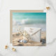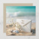 Um envelope marfim é adornado com um raminho de respiradouro de bebê e repousa no terreno arenoso da praia, acompanhado por um dólar de areia e uma estrela-do-mar.