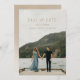 Esta opção Save the Date Card (Salvar a placa de data) apresenta texto mínimo em uma forma de cor esticada para deixar a foto se destacar. Adicione informações extras na parte traseira com um plano de textura de aquarela.
