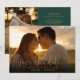 Este cartão elegante de "salve o dia" com foto e escrita em ouro apresenta sua foto e um texto de "salve o dia" acima dos seus nomes, data e local. O verso apresenta uma foto adicional, mensagem e código QR do site do casamento em um fundo verde esmeralda. Criado por Thisisnotme©
