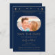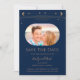 Mística Azul Dourada Sun Moon Star Space Save As Dates apresentam um sol dourado, lua e estrelas armadas sobre um fundo azul marinho escuro. Dentro é a sua foto favorita e o seu personalizado salva as informações de data. Personalize editando o texto nas caixas de texto. Projetado por ©2022 Evco Studio www.zazzle.com/store/evcostudio