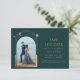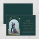 Galáxia Cósmica Célestial Salva as Datas, Astronomia Espacial da Lua Solar Dourada Verde Mística, apresenta um sol dourado, lua e estrelas num fundo verde. Dentro é a sua foto favorita e o seu personalizado salva as informações de data. Personalize editando o texto nas caixas de texto. Projetado para você por ©Evco Studio www.zazzle.com/store/evcostudio