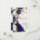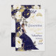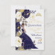 O floral azul marinho com sotaques brancos e dourados cria um belo convite Quinceanera em espanhol. Esta versão não tem uma foto, mas também está disponível um convite fotográfico nesta coleção.