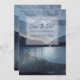 Faça com que salve a data que o noivado anuncia romântico e bonito, apresentando uma floresta, montanhas e lago com estrelas cintilantes ao anoitecer. Cor azul sólida na parte de trás do anúncio.