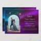 Astronomia espacial da Lua Solar Dourada Solar Roxo Celestial Astronomia Espacial da Lua nas Estrelas Místicas Galáxias Cósmicas Salvem As Datas apresentam um sol dourado, lua e estrelas num fundo cósmico roxo, teal e azul colorido. Dentro é a sua foto favorita e o seu personalizado salva as informações de data. Personalize editando o texto nas caixas de texto. Projetado para você por ©Evco Studio www.zazzle.com/store/evcostudio