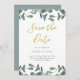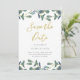Este casamento botânico simples e moderno salva os cartões de data com as folhas verdes de cor d'água eucalipto e folhagem em um fundo branco minimalista com um roteiro manuscrito moderno e falho dourado.