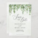 Casamento moderno dos Partidos Temáticos Salve a Data design apresenta aquarela eucalyptus verde e tipografia moderna de script combinada com a tradicional letra serif. O design é colocado sobre amostras de cor verde-d'água de sábio rústico correspondentes e acentua-se com veias de ouro elegantes. #SaveTheDate #Eucalyptus #ModernWedding