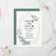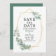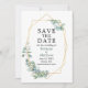 Anúncio de casamento do Noivado Eucalyptus Verenery Elegante moderno Eucalyptus Salvamento O Cartão de Data inclui folhas de eucalipto numa moldura geométrica dourada.