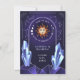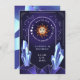 Evento Místico do Sol Salve a Data com um design místico inspirado por astrologia, esotérica, oculta e elementos misteriosos. Este design tem tons de azul, roxo e laranja, um fundo estrelado, cristais, constelações, um sol com fases na face e na lua. Inclui um modelo para personalização pessoal.