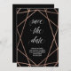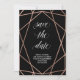 Este convite de save the date elegante apresenta um padrão geométrico em falso rosa dourado sobre um fundo preto, com tipografia moderna.