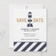 Modern Salve os convites de Data com um farol. Suas costas são compostas por listras azuis e brancas. Perfeito para sua celebração à beira-mar. © Humor 4 Cuz