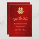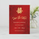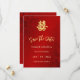 Um símbolo de dupla felicidade de ouro artístico num fundo floral vermelho brilhante. Salve o texto da data em um script manuscrito elegante. Produtos de casamento chineses correspondentes disponíveis.