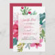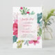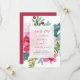 Este belo e elegante casamento de Natal ou feriado de inverno salve o cartão de data com um buquê floral de cor d'água em um fundo branco nítido. Uma mistura de flores de poinsettia, bagas ocas e folhas é colorida em tons festivos de vermelho, rosa, verde, pincel e azul. A parte de trás do convite é um vermelho colorido e rosado.