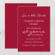 Personalize este convite moderno e elegante de "save the date" para aniversário de casamento em tom rubi. Este modelo de convite para festa de aniversário de 40 anos de casamento está pronto para você adicionar os nomes do casal, data da festa de aniversário de casamento, local e detalhes, e outras informações conforme necessário. Todo o texto é editável. Há também um modelo de texto adicional no verso, se necessário. Este cartão simples e sofisticado em tom rosa vermelho tem uma escrita branca elegante e simples que diz "celebrando 40 anos", que pode ser editado para qualquer número para outro aniversário. Personalize este cartão de "save the date" de aniversário para uma maravilhosa festa de aniversário de casamento.