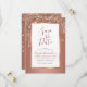 Convide-os a guardar a data para a sua festa de aniversário com estes belos cartões salve a data. Este elegante design apresenta rosa dourado e cinza de texto dentro de um elegante quadro metálico de cobre rosa dourado, com gotas de brilho e um fundo de cobre rosa dourado na frente e no verso da placa.