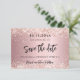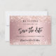 A Save the Date card for a Sweet 16, 16 (ou qualquer idade) festa de aniversário. Um fundo metálico cor-de-rosa pincelado decorado com rosa dourado falso poeira brilhante. Personalize e adicione uma data e nome/idade. O texto: Salvar a Data é gravado com um script de estilo com letra de tendência grande com alternâncias.