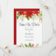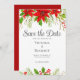 Este casamento clássico de Natal vermelho e verde Salve a data apresenta flores poinsettia brilhantes na parte inferior direita do seu convite e bagas ocas e verde no topo à esquerda. Um convite botânico festivo e brilhante para um casamento de férias com roteiro elegante.