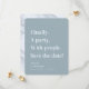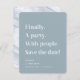 Finalmente, um texto simples do partido, com o mínimo azul empoeirado, salve a data. Um design moderno e simples destaca esta tipografia editável de cores! Finalmente. Uma festa. Com pessoas. Reserve a Data! Com uma bonito textura de mármore atrás, mas pode ser substituída pela sua própria foto. Veja meu compro para ver a suíte de casamento inteira para este design!