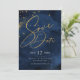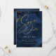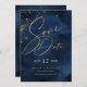 Um fundo de aquarela em tons de azul real a marinho é tocado por um abstrato de linhas de ouro finas e efeitos luminosos brilhantes para criar as peças desta bela suíte de casamento. O cartão 'Salvar a Data' do casamento mostrado aqui também apresenta texto baixo, centralizado e caligrafia elegante. Adicione facilmente seus próprios nomes, data de casamento e informações usando o modelo fornecido. Procure ID867 para ver outras peças e opções de cores para este conjunto.