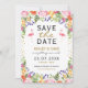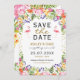 Belo convite de casamento tropical save the date com ilustração em aquarela de dois flamingos rosa, flores vibrantes e confetes dourados. Este convite personalizável é perfeito para celebrações de casamento de verão / tropical / havaiano / luau!