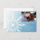 Personalize o festivo floco de neve branco no Casamento no inverno azul gelo Salve o Cartão de Anúncio de Data com os nomes pessoais da data de cerimônia de casal, fotografia e casamento para anunciar seus núpcias de tema do inverno de dezembro, janeiro ou fevereiro. Este elegante casamento de inverno personalizado mantém o cartão de data com um intrincado floco de neve branco adorando o canto com um fundo azul-claro gradiente.