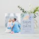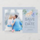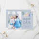 Esta foto empoeirada de folhetos azuis salvou o cartão de data é perfeito para um primavera ou um casamento de verão. O design da delicada apresenta peônias azuis leves, organizadas com pessegueiros e flores cremosas em um buquê lindo. Personalize o cartão com sua foto de noivado, nomes, data de casamento e local.