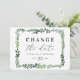 floral aquarela frondoso mudar a data cartão. Com belas folhas de aquarela e tipo moderno e ousado, este convite para mudar a data está na tendência certa e é perfeito para qualquer estação. Parte de um conjunto de casamento