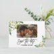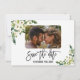 Design de cartão único e elegante com lindos buquês de rosas e peônias em aquarela branca, espaço para sua foto, "save the date" em caligrafia moderna, em um fundo branco. Use a ferramenta Personalizar para adicionar suas informações, alterar fontes e cor do fundo. Para itens correspondentes, visite minha Coleção Floral Branca em Flor