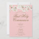 Uma elegante primeira comunhão sagrada salve o cartão de data com uma delicada flor branca enquadrando seus primeiros detalhes sagrados em tipografia elegante de ouro em um bonito fundo rosa. Projetado por Thisnotme©
