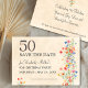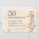 Floral elegante 50º aniversário flor 50 anos Cartão plano de lançamento. Marque este aniversário milestone com elegância usando o nosso 50º aniversário Salve o cartão Data com um delicado design floral de aquarela. Este cartão lindamente trabalhado destaca o número "50" em negrito, balanceado com um arranjo floral macio e pastel no lado direito. Personalize com o nome e os detalhes do evento do celebrante para garantir que seus convidados reservem a data para esta ocasião especial. Perfeito para qualquer elegante e memorável celebração de 50 anos. Aproveite!