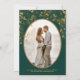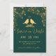Anuncie o seu casamento com estes elegantes cartões de save-the-date em esmeralda e dourado. Eles apresentam pássaros dourados, flores douradas e tipografia moderna em fundo esmeralda. Insira sua foto e o site do seu casamento no verso.