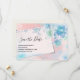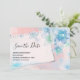 Aniversário ou chá de fraldas guarde o cartão de data com lindas flores azuis em fundo rosa. Uma imagem de uma página de notebook em forma de retângulo colocada sobre cima para que você escreva seu dentro de texto.