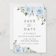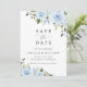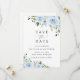 Convide amigos e família de estilo e defina o tom para seu dia especial com este charmoso cartão de data. Design apresenta flores azuis poeirentas de cor d'água e verde sobre fundo branco.