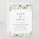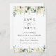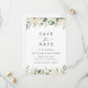 Convide amigos e família de estilo e defina o tom para seu dia especial com este charmoso cartão de data. Design apresenta flores brancas de aquarela e verde em fundo branco.