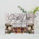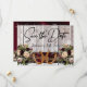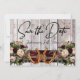 Este design tem uma elegância rústica, mantendo um tema simples. Fundo de madeira de celeiro com fita bordô, ferraduras amarradas e buquês de flores silvestres com espaços reservados para a data na frente. Espaço reservado para uma foto do casal está no verso do cartão com nomes e a escrita "Gettin' Hitched" em um fundo de fita correspondente. Projetado para combinar com a coleção "Gettin' Hitched - Horseshoes, Ribbon & Lace". Para alterar os detalhes, clique em «Personalizar». Para mover o texto ou alterar o tamanho, a fonte ou a cor do texto, clique em «Clique para personalizar ainda mais»