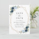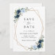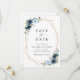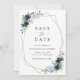Convide amigos e família de estilo e defina o tom para seu dia especial com este charmoso cartão de data. Design apresenta flores marinhos e azuis de cor d'água, tela verde e estrutura dourada sobre fundo branco.
