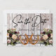 Este design tem uma elegância rústica, mantendo um tema simples. Fundo de madeira de celeiro com fita bordô, renda, ferraduras amarradas e buquês de flores silvestres com espaços reservados para a data na frente. Espaço reservado para uma foto do casal está no verso do cartão com nomes e a escrita "Gettin' Hitched" em um fundo de fita correspondente. Projetado para combinar com a coleção "Gettin' Hitched - Horseshoes, Ribbon & Lace". Para alterar os detalhes, clique em «Personalizar». Para mover o texto ou alterar o tamanho, a fonte ou a cor do texto, clique em «Clique para personalizar ainda mais»
