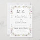 Lindas, simples e doces flores silvestres criando uma moldura sutil em torno deste lindo cartão de "Salve a Data" de casamento. Fundo branco limpo. Adicione seus monogramas iniciais no topo deste lindo cartão de lembrete.