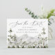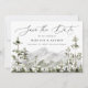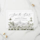 Rustic salva as datas com "Salvar a Data" em um roteiro elegante de caligrafia com uma paisagem de cor d'água em árvores e montanhas verdes. Personalize a frente da montanha da floresta guarde as datas com seus nomes, data de casamento e local do casamento. O tema da natureza salvará os inversos de data para exibir seu site de casamento e quaisquer detalhes importantes do casamento.