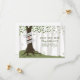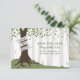 Um casamento ao ar livre salva a data que apresenta a ilustração de uma árvore na floresta com folhas verdes e raízes expostas com um cartaz embrulhado em volta do tronco para nomes de casal.