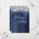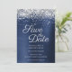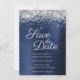 Crie seu casamento moderno, salve as datas. Bordas superiores brilhantes e brilhantes, finas, emparelhadas com uma folha metálica azul-marinho clara a escura, esfregada em massa. Toda a textura brilhante, faísca, metálica e brilhante é criada por uma imagem gráfica digital impressa. O estilo e a cor da fonte podem ser personalizados.