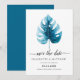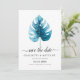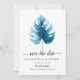 Design moderno de cartão de aviso de casamento com ilustração de folha de monstera em aquarela sobre um fundo branco simples. O verso do convite é em cor azul profundo.