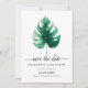 Design moderno de cartão de aviso de casamento com ilustração de folha de monstera verde em aquarela em um fundo branco simples. O verso do convite é em cor verde profundo.