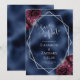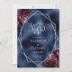 Este elegante casamento moderno salva o cartão de data apresenta uma estrutura geométrica prateada decorada com buquês florais de burgundy e prata em um fundo azul marinho de folha azul. O texto personalizável combina a escrita manual imétrica de cinzas prateadas, a placa de cobre e as fontes itálicas.