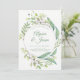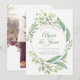 Este cartão de salve a data moderno e elegante apresenta uma moldura de aquarela verde folhosa e tipografia moderna, em um fundo branco. O verso apresenta sua foto pessoal.